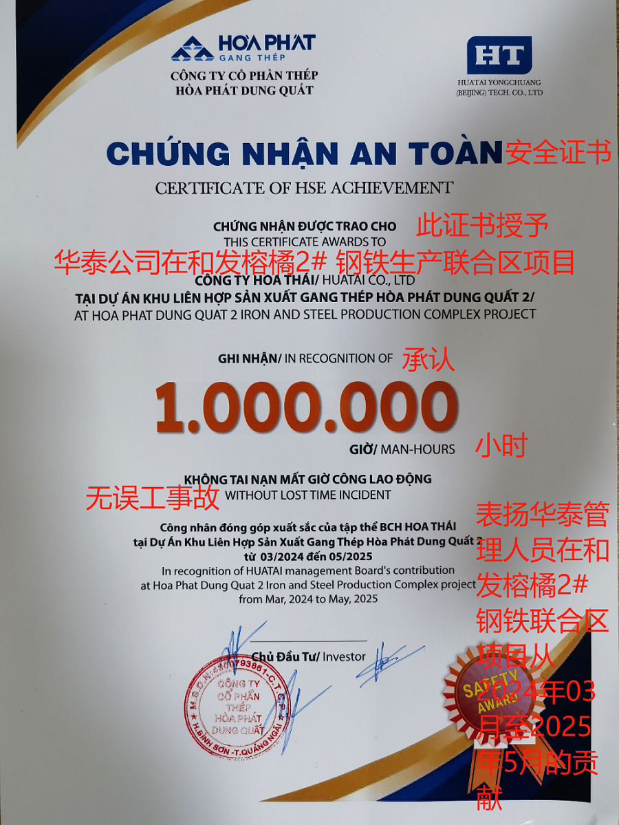 On July 2nd, 2025, the Hoa Phat Dung Quat project department of HT received the Zero-Accident in One-Million Man-Hour Award from Hoa Phat Dung Quat steel plant. This marks the first time a Chinese EPC contractor has won this award in recent years. The award signifies strong recognition from the client for safety management, serving as another significant milestone for HT in the overseas EPC engineering market.